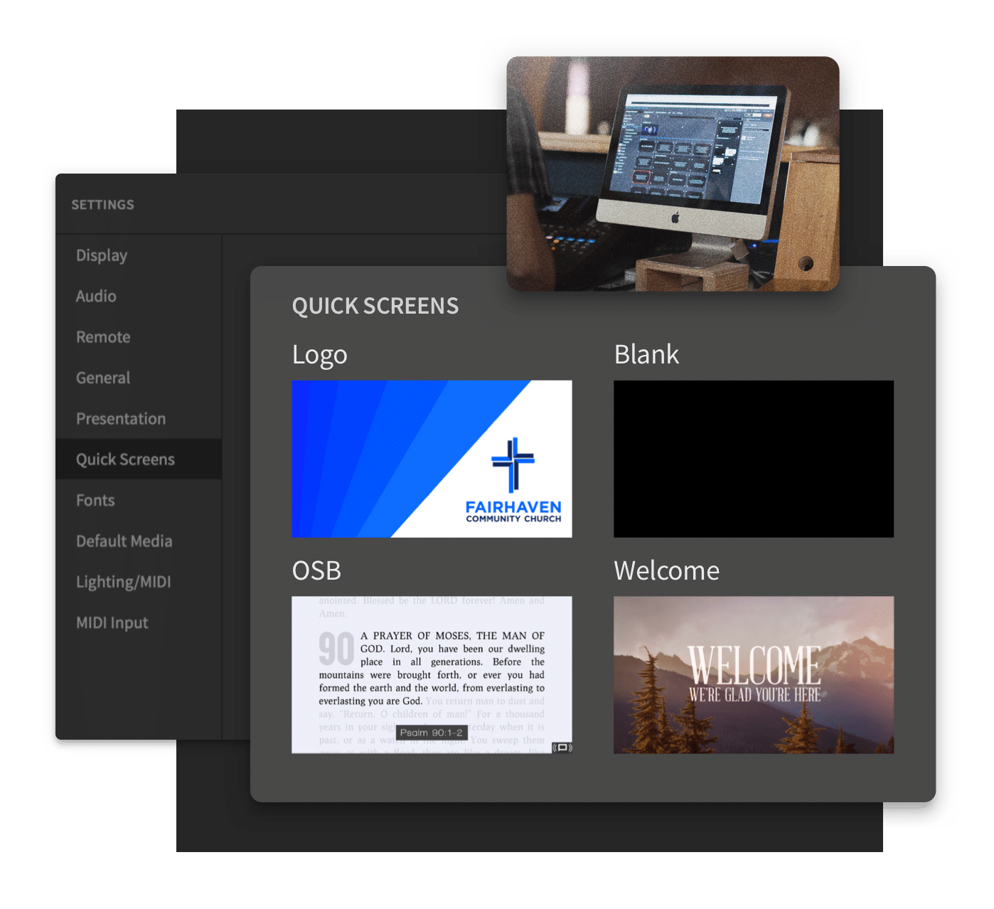 Any slide can become a Quick Screen. So whether you want to switch to the sermon series title, a blank slide, or an important announcement, you can do it in seconds thanks to Quick Screens.
