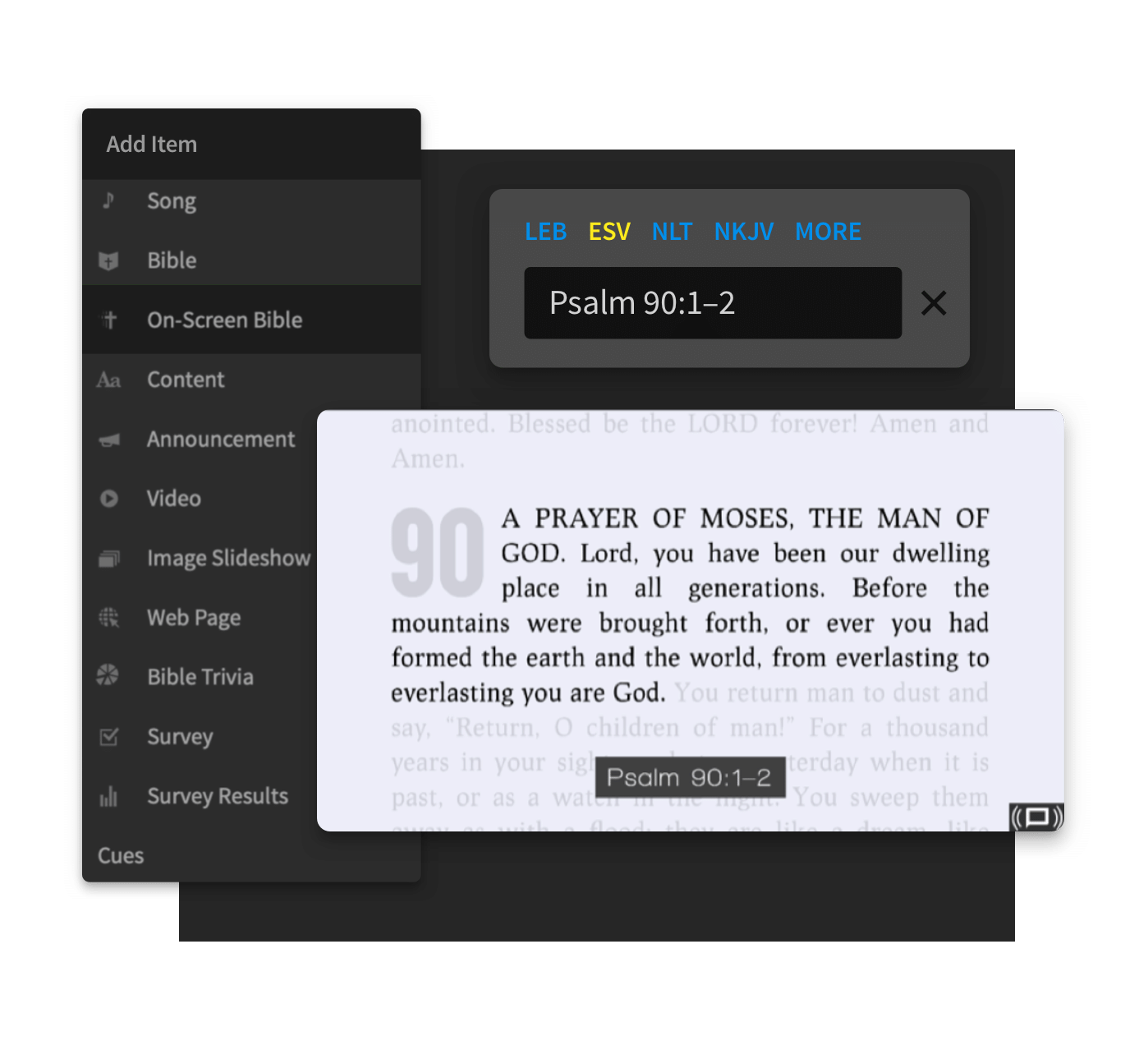 When the pastor quotes a verse that’s not in the presentation, show it in context with the On-Screen Bible Quick Screen. And if they make an extra push on a pivotal point, employ your secret weapon—a blank slide Quick Screen. Suddenly, there’s nowhere else to look but at the Word and its preacher.